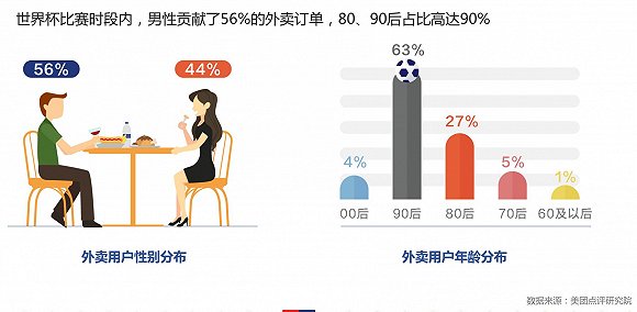 世界杯比赛时段内,男性贡献了56%的外卖订单,比例上略胜女性球迷;其中80和90后的男性稳稳占据外卖订单量先锋,占比高达90%。