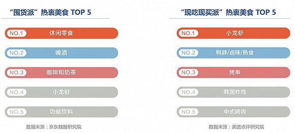 吃货球迷队伍分为两派,“囤货派”固守囤货姿势,零食,酒,饮料等最受欢迎;“现吃现买派”则热衷于随时购买新鲜的小龙虾、鸭脖/卤味/熟食、烤串等。