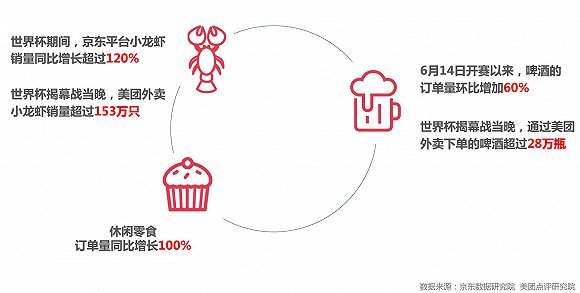 京东大数据显示,自6月14日开赛以来,一向受欢迎的啤酒订单量环比也增加了60%,休闲零食的订单量同比增长达到100%。京东平台小龙虾的销量同比增长超过了120%,相比往年更受欢迎。世界杯开幕战当晚,美团外卖小龙虾销量就超过153万只,啤酒销量则超过28万瓶。