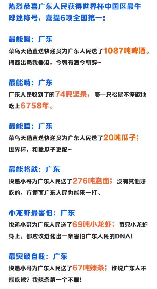 据菜鸟数据显示,广东球迷收到菜鸟天猫直送小哥送出的1087吨啤酒,74吨坚果、20吨瓜子、276吨泡面、69吨小龙虾以及67吨辣条,获得六项全国第一。