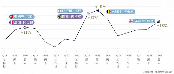 美团数据显示,梅西、内马尔等超级球星比赛的场次,夜间外卖较平日上涨17%,法国队的姆巴佩、比利时队的卢卡库、英格兰队的凯恩出场时,外卖订单都有所上涨。