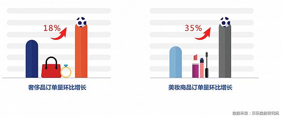 世界杯也带动了京东平台上的女性消费的激情,奢侈品和美妆订单增长明显,奢侈品订单量环比增长了18%、美妆商品订单量环比增长35%。体脂称订单量同比增长也超过60%。
